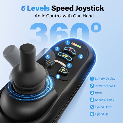 Operate the chair with an easy-to-use joystick that allows smooth 360° turning. Choose from 5 speed levels to suit different environments. The clear battery display shows remaining power at a glance. An automatic braking system engages when the joystick is released, while dual manual brakes provide additional control when needed.