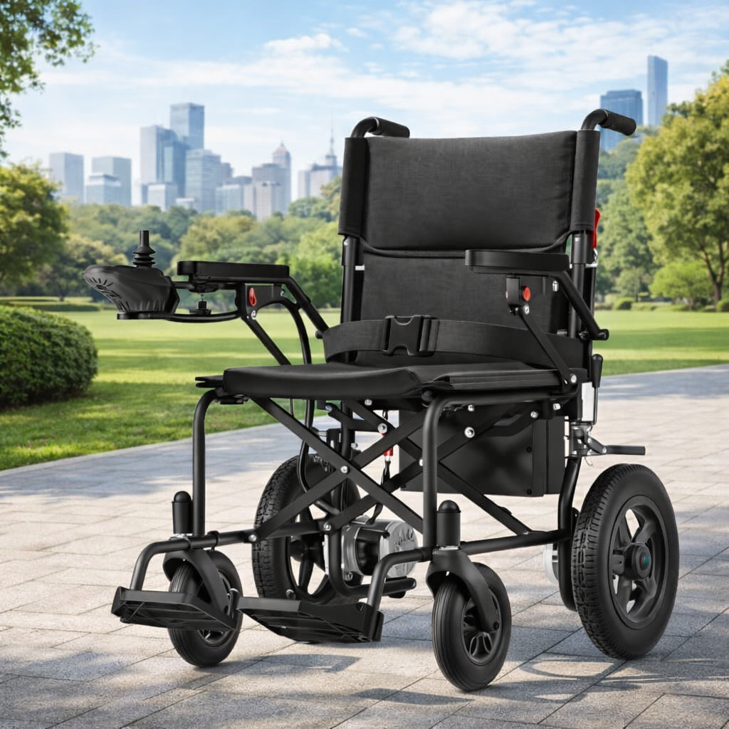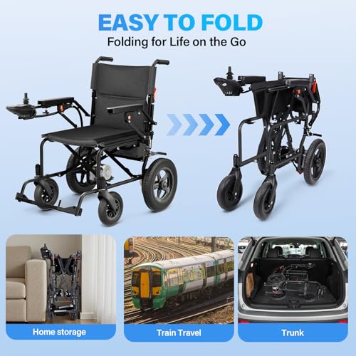 Set up in about 3 minutes and fold easily in three simple steps. Featuring a removable battery, this lightweight power chair folds into a compact 36.2 × 26.5 × 14.1 inches (92 × 67.5 × 36 cm) and weighs only 45 lbs (without the battery), making it easy to place in most car trunks. Its space-saving design is ideal for travel, short trips, and everyday outings.