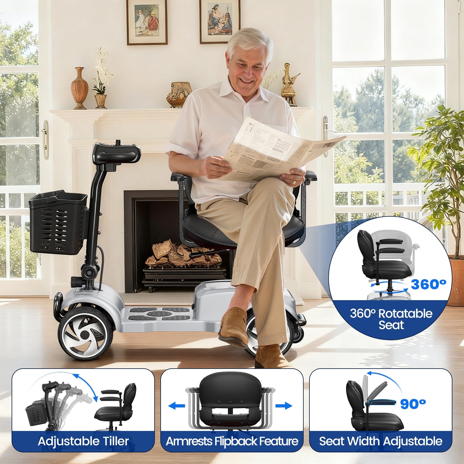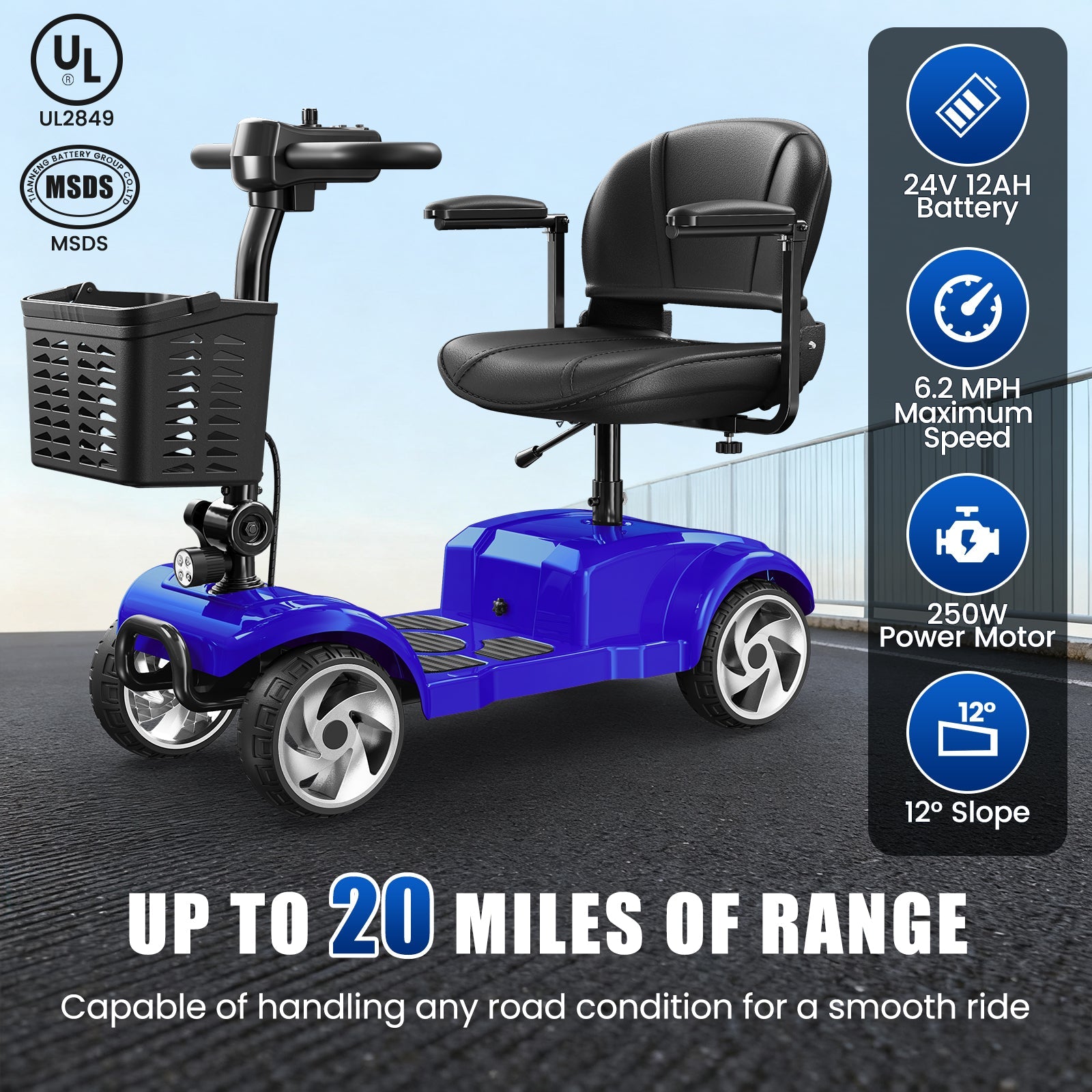 Powered by a 24V 12Ah battery and a dependable 250W motor, this 4-wheel electric mobility scooter delivers smooth, stable performance for everyday use. With a top speed of 6.2 mph and a full charge time of just 5 hours, it provides up to 20 miles of travel range.