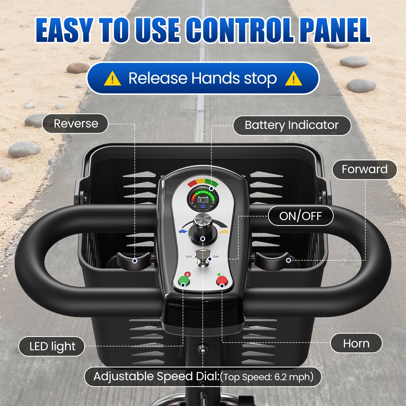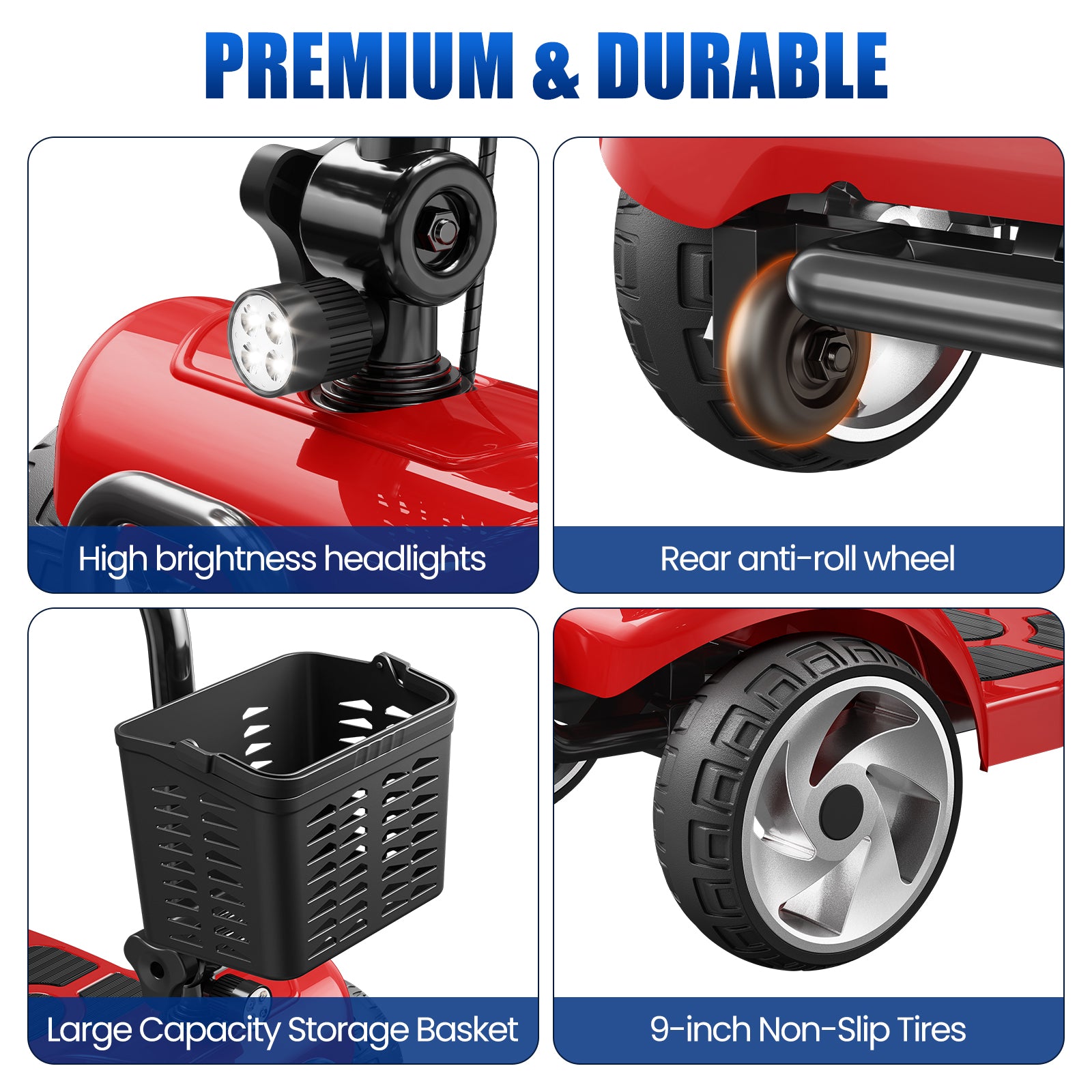 Designed for both indoor surfaces and outdoor pathways, it can handle slopes up to 12°. Equipped with 9-inch anti-slip, puncture-resistant tires and a reinforced frame supporting up to 330 lbs, it offers reliable durability and control across different environments.